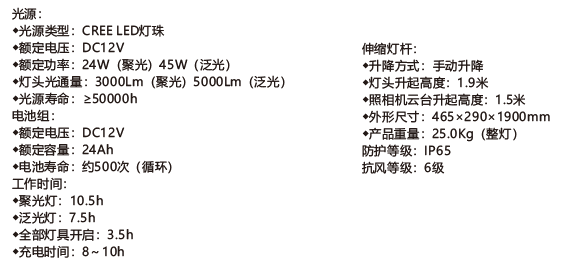 可直接使用電池供電,所有燈亮<35h,聚光燈亮<10.5h,泛光燈亮<75h;并配有車載電源線,電量不足時可采用車載電瓶進行供電